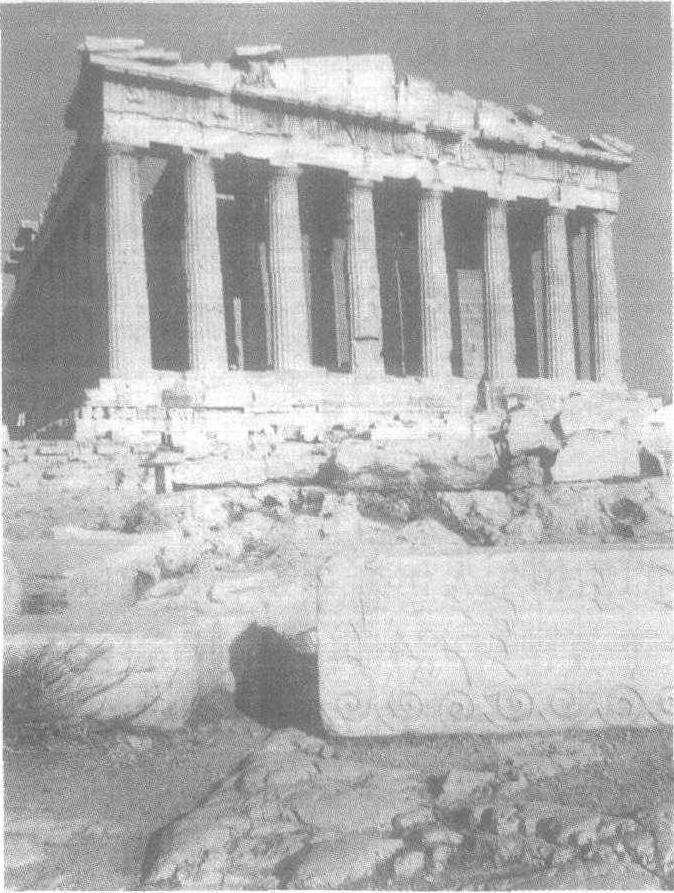 | 释义 | 帕提翁神庙雅典卫城中祀奉雅典守护神雅典娜的神庙。始建于公元前447年,完成于公元前432年,为纪念雅典战胜波斯侵略者的胜利而建。是希腊神庙中最早和最典型的形式,采用长方形平面的列柱围廊式,东面和西面的柱廊有8根列柱,南北各有17根列柱,所有柱子均向后倾侧7cm,各边列柱又向中央略有倾侧,使柱廊更显高耸稳定。神庙的三层基座台阶和上侧山花的檐部,均在中部略为起拱,防止了建筑中部下陷的感觉,四根角柱均略为加粗,开间稍加收缩,以校正角柱在天空明亮的背景下显得细小端部开间过大的错觉,充分反映了古希腊建筑师在运用视觉原理对建筑进行细致入微的设计方面,已达到了很高的水平。神庙外廊的多立克柱式比例优美均称,具有饱满挺拔和开朗的风格,雕刻精致,被誉为多立克柱式的典范。东柱廊上部山花刻有雅典娜诞生,西部柱廊有波赛顿和雅典娜争夺雅典保护权的高浮雕,雕刻涂以金、蓝、红的艳丽色彩,建筑除屋顶用木外,全部以白色大理石砌成,显得庄重华丽,富有欢乐庆典的气氛。