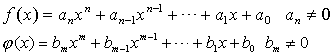 对于数域F上任何两个多项式bm≠0其中(x)≢0,存在F上唯一的一对多项式q(x)及r(x),满足下列条件❶r(x)的次数小于m,或者r(x)≡0;❷恒等式f(x)≡q(x)(x)+r(x)成立.多项式q(x)和r(x)各叫做不完全商及余式.这个定理是一元多项式分解理论的基础.q(x)及r(x)的求法叫做多项式f(x)被(x)除的带余式除法.显然,要使多项式f(x)能被(x)整除,其充分必要条件是f(x)除以(x)时所得的余式恒等于零.