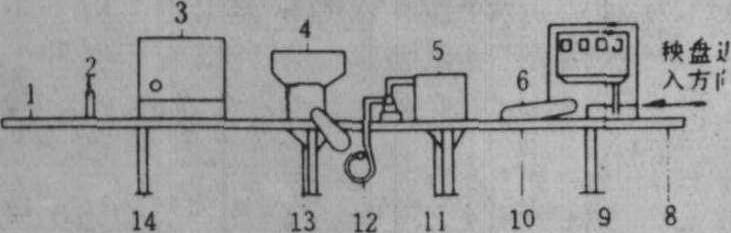 图1 土肥混合机 播种作业流水线 带土苗育秧的核心设备,由机架、输送带、床土铺放装置、喷水装置、播种装置及覆土装置等组成(图2)。能在输送带上一次完成在育秧盘内铺放床土、喷水、播种、覆土作业。秧盘由电机驱动的一组同步三角带输送,通过床土箱下方时,经粉碎与处理过的床土由床土箱底部的滚轮或带齿胶带排出,铺放于秧盘底层。然后由刷土器的旋转毛刷滚轮将秧盘内多余床土刷出以控制秧盘内床土厚度。秧盘继续前移经过喷水装置将床土淋湿,再前移至播种装置进行播种。播种机的排种部件为直齿槽辊,通过槽辊与毛刷板间的间隙调节播种量。种箱接受的种子应经破胸露白、脱芒、脱水处理,以保证播种质量。当秧盘在铺放床土、喷水、播种后,覆土装置在种子表面再覆盖一层5~7毫米的床土。其结构与床土铺放装置相同。这种播种作业流水线需要6~7人操作,即加装秧盘1人,为床土箱装土1人,操纵电器控制箱,调整床土厚度,喷水量、播种量和添加种子需1人,在覆土装置内加土1人,从传送带将完成播种的秧盘取下并送至出芽室2人。整个流水线的生产率为500盘/小时。