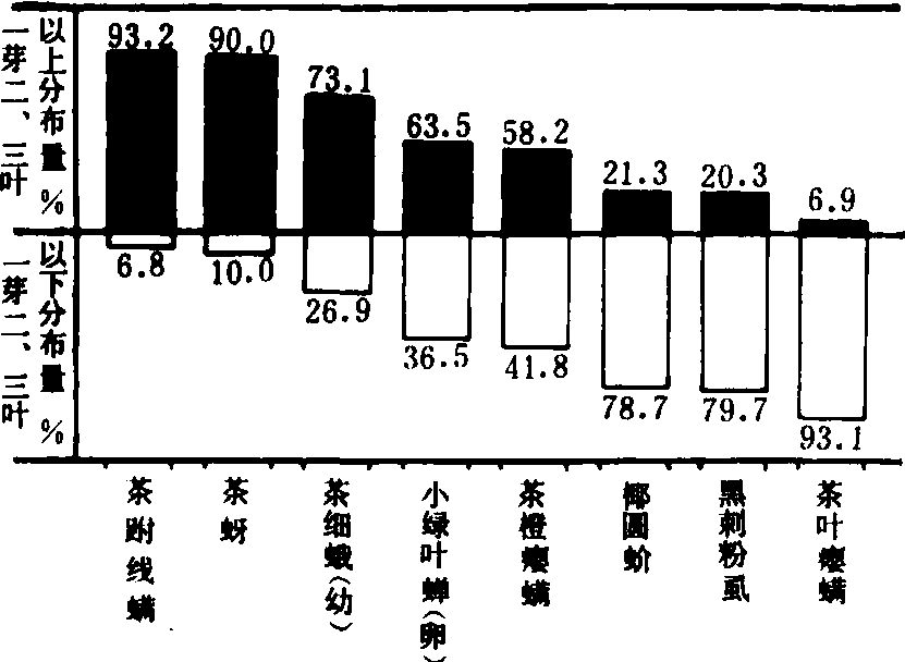 图2 茶树修剪对害虫的影响 此外, 冬季普遍清园对于消灭越冬病虫、减少来年发生基数很有作用。 生物防治 利用某些生物或其代谢产物来防治茶树病虫害的技术措施。其优点是对人畜无毒害, 不污染环境,对天敌、作物以及其它有益生物无不良影响,对病虫且常有较长时间的控制作用, 一般也不会使病虫产生抗性。茶叶作为人类的饮料, 采摘批次多, 间隔期短, 直接加工冲泡饮用, 对其色、香、味和农药残留要求严格, 茶园用药必须限制, 因此生物防治更感迫切。茶树属多年生常绿植物, 生长郁闭, 茶园生态条件比较稳定, 天敌资源较为丰富, 较之一般农田更适于开展生物防治。应该重视茶园自然天敌的保护与利用,合理用药, 做到化学防治与生物防治相结合,协调运用。 生物防治一般包括三个方面: ❶利用天敌防治害虫, 诸如食虫昆虫、蜘蛛、捕食螨、食虫鸟和两栖类等; ❷“以菌治虫”,即利用昆虫病原微生物防治害虫,如真菌、细菌、病毒等; ❸“以菌治病”, 即利用某些微生物对植物病原的拮抗作用, 防治植物病害。例如哈茨木雷对白绢病有明显的拮抗作用。 化学防治 即利用某些有毒的化学物质(农药)防治病虫害的技术措施。其优点在于作用快、效果好、工效高、使用简便; 受地区和季节限制小, 且适合于工厂化生产和大面积机械化应用。因此, 化学防治在茶树病虫综合防治中占有相当重要的地位。但是, 长期大量使用化学农药, 会大量杀伤天敌, 破坏生态系统中不同种群的平衡, 造成害虫再增猖獗, 某些次要害虫上升为主要害虫;长期单一使用某种农药,常会引起病虫形成抗药性, 降低防治效果; 大多农药均有较大毒性, 使用不当, 会造成环境污染和农药残留, 影响生态环境和人体健康。为此,必须强调安全合理用药,并把化学防治纳入综合防治中的适当位置, 与其它防治措施配合协调运用。 茶树病虫害化学防治, 由于茶叶生产的特点而有其一定的特殊性。主要因为茶树采收部位即直接喷药部位, 而且连续多次采收,前后采收的间隔时间较短,甚至只有几天, 采下的鲜叶又不经洗涤即直接加工成干茶, 供冲泡饮用。所以, 茶园施药除了必须考虑低毒外。还应具有在茶树鲜叶上降低速度较快、残留期较短、在加工过程中易于挥发消失、在水中溶解度较低、对成茶品质无不良影响等优点。因此, 茶园开展化学防治, 必须合理选用低毒低残留农药品种, 进行科学用药, 以确保茶叶品质, 降低农药残留量。 物理、机械防治 应用各种物理因子和机械设备防治病虫害。其中包括以不同作用原理为基础的多种措施, 如❶捕杀或摘除, 又分人工和器械两类; ❷诱集与诱杀, 包括灯光诱杀、食饵诱集或诱杀、潜所诱集、作物诱集、异性诱集或诱杀等; ❸阻隔,如套袋、涂胶、刷白、填塞等; ❹分离, 如汰除带病虫种子、贮粮害虫与粮食分离等; ❺温湿度, 如日光、蒸气、低温、高温等的应用; ❻新技术, 包括放射能、高频率电流、超声波以及激光的应用等。 目前, 茶园中常用的防治方法是:捕杀或摘除、灯光诱杀、食饵诱集或诱杀等。对于茶毛虫、茶蚕、大蓑蛾、茶蓑蛾等体形较大、行动较迟缓、容易发现、容易捕捉或具集性的害虫,均可采用人工捕杀的办法;对于绿丽纹象等具假死习性的害虫, 在振落的同时, 要用器具承接; 对于蛀干害虫可以刺杀; 对许多病害可以摘除病叶、剪除病枝或拔除病株; 对地衣、苔藓可于雨后用半圆形侧口竹刀刮除。利用害虫的趋光性,可以设计诱虫灯, 既作预测用, 也可直接歼灭害虫。一般以电灯、黑光荧光灯加电灯或日光灯作为光源, 过去也有用汽灯或直接燃火诱杀的。在应用短光波的同时, 还可配以吸风装置或电网, 制成强力诱虫器。利用害虫的趋化性, 可以饵料诱集害虫, 或添加杀虫剂诱杀害虫,例如糖醋毒液诱杀卷叶蛾, 毒谷诱杀蝼蛄,堆草诱集地老虎。对于茶毛虫等雌蛾诱惑雄蛾能力颇强的害虫, 可采用异性或性外激素粗提物诱集或诱杀的办法。放射能等新技术, 在茶园中尚少应用。 |