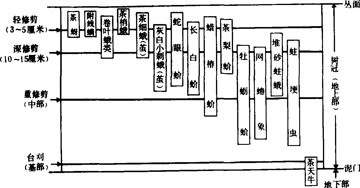 图1 茶叶采摘对害虫的影响 修剪、台刈 对于茶梢蛾、茶堆沙蛀蛾、茶蛀梗虫、天牛、木蠹蛾等钻蛀性害虫和茶梢黑点病、膏药病、苔藓、地衣等枝干病害以及茶小蓑蛾, 可分别情况采用轻修剪或剪除病虫枝等进行防治。对严重感染病虫或衰老的茶树, 则可台刈更新(图2)。