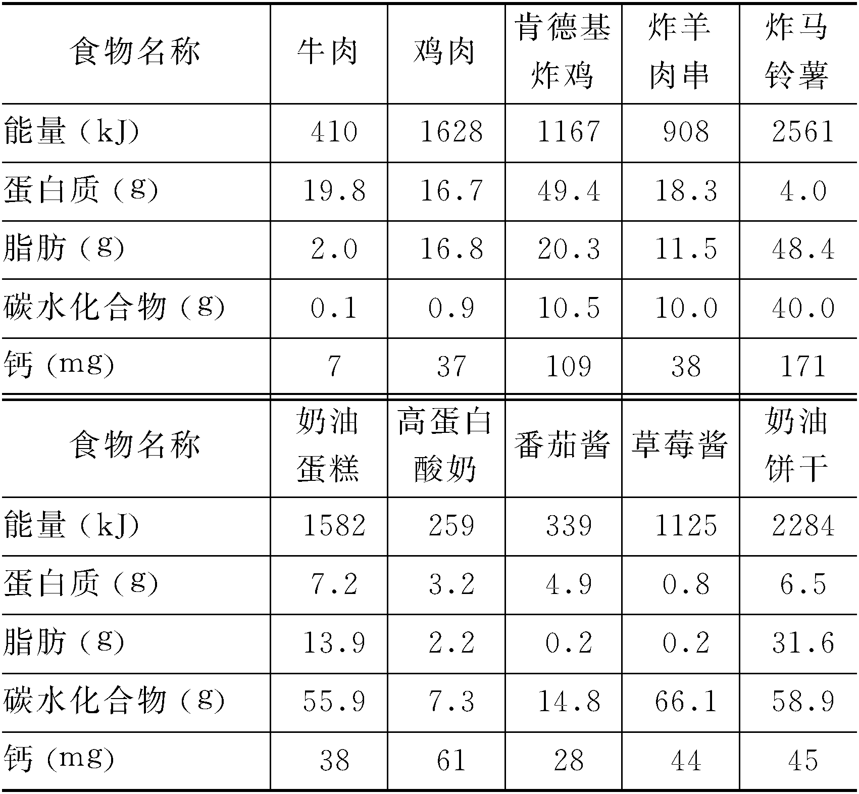 | 释义 | 常见快餐食品成分《美国临床营养学杂志》发表对麦当劳、肯德基售出食品的分析:一份快餐总能量为4136~8158kJ,已经超出人体一天所需的热量3~5倍;每份含脂肪57~77g,占总能量的36%~52%。专家警告,快餐食品会直接引发单纯性肥胖。科学的食物结构应该是:碳水化合物占70%,脂肪占20%,蛋白质占10%;但油炸食物中碳水化合物占30%,脂肪和蛋白质却占70%。人民卫生出版社《食物成分表》(1991)“北京地区食物成分”中列出常见快餐食品成分(每100g):