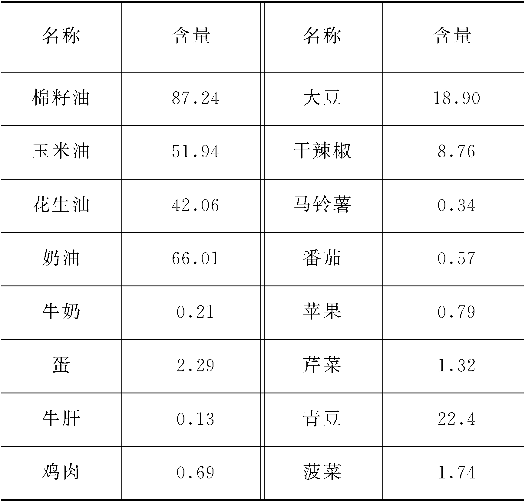 常见食物每100g中维生素E的含量见下表(单位:mg):