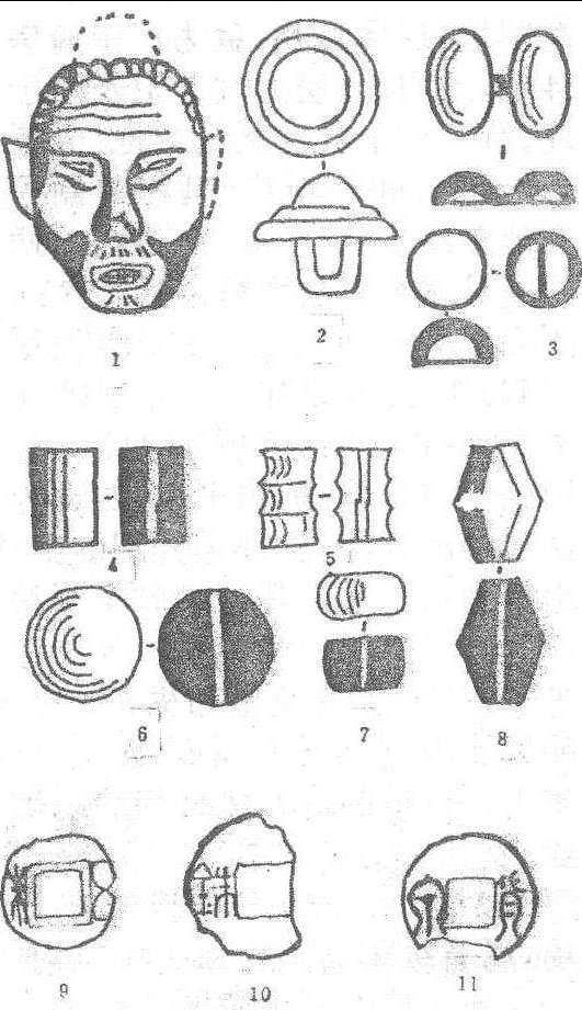 (1.铜面具2.青铜釦3.卵形镀金具木4~8.玛瑙珠9~10五珠钱11.贷泉钱) |