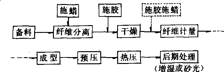 | 释义 | 干法纤维板fiberboard by dry process以气流为载体输送纤维以使板坯成型制成的纤维板。该法生产纤维含水率在10%左右,需加胶粘剂使纤维结合。产品两个表面均光滑,不存在废水污染问题。干法纤维板生产工艺如图。