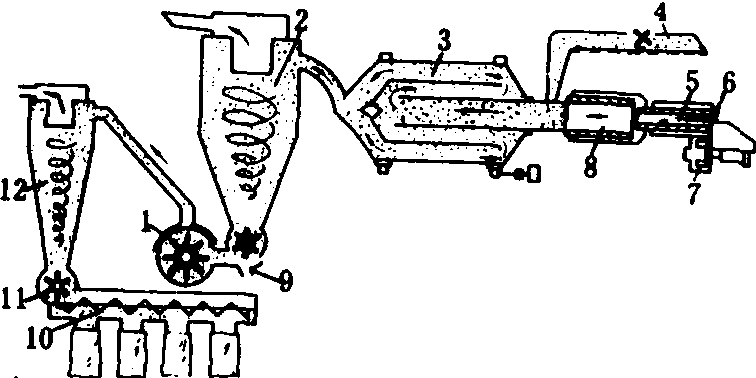 干草粉生产工艺流程图 1. 粉碎机; 2. 干牧草旋风分离器; 3. 干燥滚筒; 4.青牧草输送器; 5. 气化室; 6. 喷油嘴; 7. 风机; 8.燃烧室; 9. 杂余分离器; 10. 卸料螺旋; 11. 闭风器; 12. 干草粉旋风分离器 刚加工出来的干草粉只损失5%的胡萝卜素,用三层纸袋包装,贮存9个月,胡萝卜素损失65%,蛋白质损失1.6~15.7%。如制成颗粒,在同样条件下,其损失相应为6.6%与0.35%。干草颗粒的容重为650~700千克/米3,是干草粉的2~2.5倍,便于运输和贮存。 干草粉制粒机与配合饲料制粒机类似。但干草粉纤维含量高,容量小,加工时压粒器磨损快,生产率和压粒部件寿命仅为配合饲料制粒机组的1/3和1/4,功率消耗也大。 干草粉加工机组hay mill and processing unit将草粉加工成颗粒饲料的成套设备。主要由干燥机、粉碎机及压粒机等组成。干燥机用来干燥牧草,多采用气流滚筒式干燥机或强制通风干燥,干燥后的干草被气流输送至粉碎机粉碎。为避免干草缠绕滚筒,在粉碎室顶盖上装有固定的切草刀,粉碎锤片上装有锤刀。粉碎后的干草由筛网排出送往压粒机,经湿润后,压制成一定长度的颗粒。 |