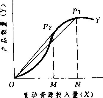 按照某一变动资源不同投入水平所取得的平均产量数据在坐标图上绘成的曲线。如图中的OP1、OP2。由图可知,变动资源投入量为ON时的平均产量为,这一比率正是OP1直线的斜率。同样,变动资源投入量为OM时的平均产量亦即OP2直线的斜率。因此,从曲线图来看,任何数量的变动资源的平均产量,都可用连结原点O至总产量曲线上对应点的直线的斜率来表示。当这条直线的斜率大时,表示平均产量的值较大(如OP2);如这条直线的斜率小,表示平均产量的值较小(如OP1)。(见“平均产量”)
