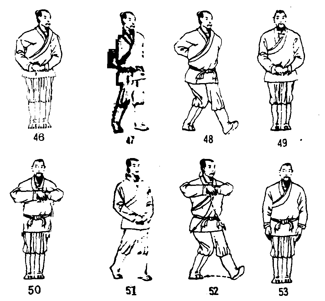 ❽还原成并步站立势。(图53)第4个8拍同第3个8拍,唯右脚向右前方上步,两掌相叠(右掌在下)做动作。练功次数;共做4个8拍。第4个8拍的第