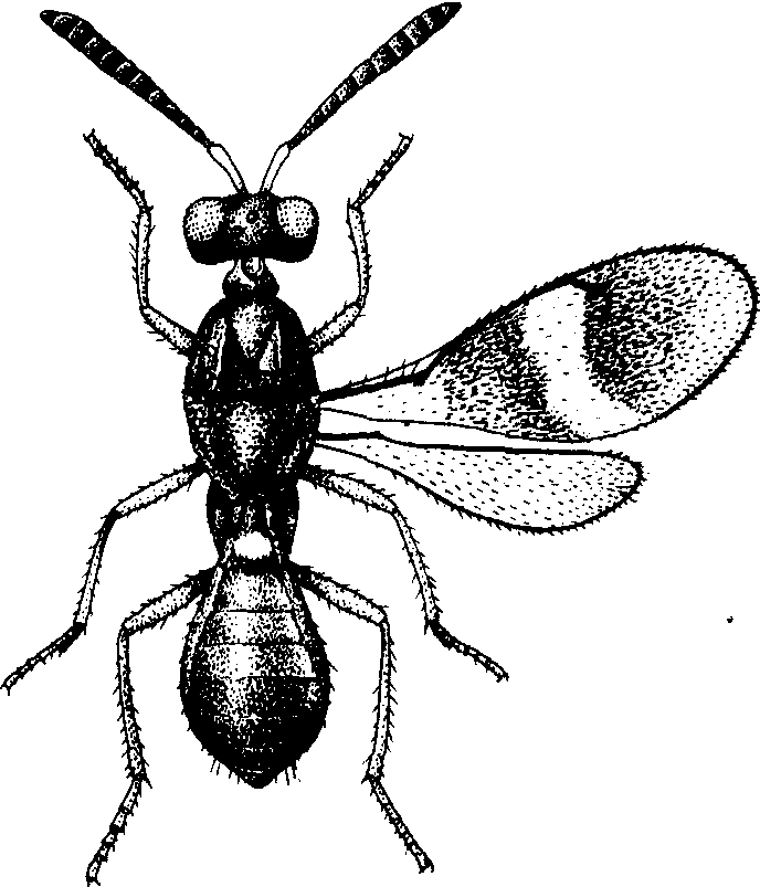 形态特征 成虫古铜色,雌蜂体长3~3.5毫米;雄蜂2~2.5毫米。复眼发达,背面3个单眼排列近于等边三角形。触角13节,被有短毛,略短于胸部。中胸背板前中部有舌状隆起,古铜色; 后部铜蓝色、微陷,略短于舌状部、被毛。雌蜂中胸背板小盾片和三角片有顶针状刻点。前翅淡褐色,有短毛,基部透明,中央有一透明弯形横条斑。雄蜂触角比雌蜂粗长,中胸背板及三角片无顶针状刻点,翅全部透明(见图)。
