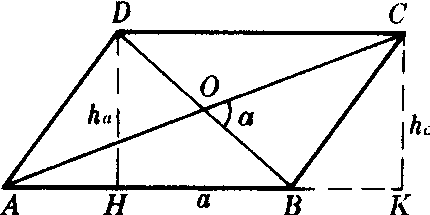 ❶平行四边形对边间的距离叫做平行四边形的高,这组对边中的一条边叫做平行四边形的底.平行四边形的面积等于它的底和高的积.如图,底AB=a,高DH=ha,面积S=aha. ❷平行四边形的面积等于两条对角线及它们夹角正弦乘积的一半. 如图,对角线AC=m,BD=l,夹角为a.则面积S=ml·sina/2. |