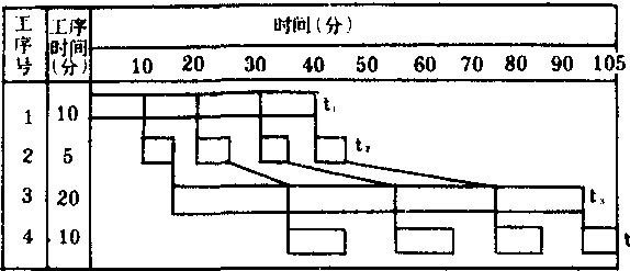 | 释义 | 平行移动方式劳动对象在工序之间移动和工序之间在时间上衔接的一种时间组织方式。一批零部件在上道工序每加工完一件以后,就立即送往下道工序去加工,使一批零部件能同时在两个或两个以上的工序平行加工。这种方式生产周期最短,但在前道工序时间长,后道工序时间短的情况下,出现等待空闲时间,这些等待空闲时间很零碎,不能充分利用。如图示: