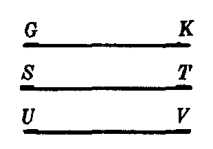 图3 平行线的判定定理还有如下两个: ❻垂直于同一条直线的两条直线平行.如图2,若PQ⊥MN,RH⊥MN,则PQ∥RH; ❼平行于同一条直线的两条直线平行.如图3,若直线GK∥UV,ST∥UV,则GK∥ST. |