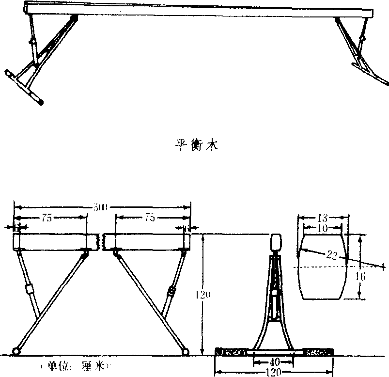 平衡木尺寸示意图 平衡木Pinghengmu体操器械的一种。典型平衡运动项目。❶平衡木是基本体操练习内容之一。18世纪后期出现在德国,后流传欧美各国。作为基本体操练习的平衡木,其器械可高可低,可长可短,可水平放置,也可倾斜。木面可是平面,也可成圆形。练习时可一人、两人及多人同时在木上完成动作。它可以改善人的平衡器官,提高身体的协调性,培养良好的肌肉感觉,以及勇敢、果断、沉着的优良品质,适宜在小学开展。 平衡木体操器械之一,也是女子竞技体操项目之一。19世纪中叶,德国体操家A.施皮斯(1810~1858)提倡女子体育,并将平衡木上的练习列为学校女子体操教学与训练内容。1936年在德国柏林举行的第11届奥运会上被正式列为比赛项目。据日本体操辞典(昭和53年3月30日出版)记载,当时的平衡木宽度仅为8cm。在中国,平衡木的比赛于1954年在大连举行的13城市体操比赛中第一次出现。在国际、国内体操比赛中,平衡木器械的规格为:长度为5m、宽度为10cm、高度为1.20m、木的厚度为16cm、木的表面有一层覆盖物(厚度约1cm)。2001年出版的《国际女子竞技体操评分规则》规定:平衡木一套自选动作的时间不得超过1min30s;超过时间限制将被扣去0.10分;成套动作的时间少于30s,将被扣去2.00分;练习中若从器械上掉下,允许中断练习10s(中断时间另行计算),但掉下一次将被扣去0.50分。成套动作由上法、木上各种技巧翻腾动作与体操动作的巧妙结合以及下法组成。自选动作须按规则所要求的内容、难度与其数量以及特点要求等予以编排,并充分考虑其艺术性。 |