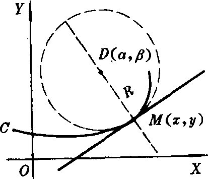 图2 在点M处作曲线C的法线,并在曲线凹的一侧,在法线上取一点D,使|MD|=R,则称以点D为圆心以R为半径的圆为曲线C在点M的曲率圆. 曲率圆的圆心D叫做曲率中心 (图2).曲线C在点M的曲率圆具有以下性质:❶曲率圆与曲线C在点M有公切线. ❷曲率圆和曲线C在点M附近有相同的凸性. ❸曲率圆与曲线C在点M有相同的曲率. 设在曲线y=f (x)上,y″≠ 0,则曲线在点M的曲率中心D (α,β) 的坐标为