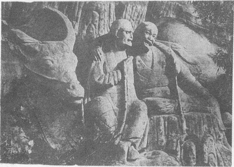 | 释义 | 并肩耳语为四川大足宝顶山大佛湾牧牛道场中“驯服图”和“无碍图”里的一段情节,表现两位牧童偎依在山石上,各将手搭于对方肩头,并肩耳语、亲昵无间,沉浸在欢乐中。两位牧童天真无邪,无忧无虑,似已完全忘情世事。牧牛道场共描绘了10组牧童与牛的活动场面,即未牧图、初调图、受制图、回首图、驯服图、任运图、相忘图、独照图、双忘图。意在告诉人们修心忘情的过程,故又称之为十牧调心图。这些图象是用来阐明“本来无事,理宜丧己忘情,情忘即绝苦因,方便一切苦厄,此以忘情为修”的禅宗教义。禅宗以修心为本。四祖道信曾对牛头山法融禅师说:“夫百千法门,同归方寸,河沙妙德,总在心源,一切戒门、定门、慧门、神通变化,悉自俱足,不离汝心。一切烦恼业障,本来空寂,一切因果,皆如梦幻,无三界可出,无菩提可求,人与非人,性相平等。大道虚旷,绝思绝虑。”图像很充分地体现了这种思想。为了点明主题,图后题刻了“了了了无无所了,心心心更有何心?了心心了无所止,圆灯无私耀古今。人生不见杳无踪,明月寒光万象空,若问其中端的意,野花芳草自丛丛。”艺术家大概正是带着“无无所了”的心情从事创作的,所以形象才显得格外亲切,尤如一首优美的田园牧歌诗。