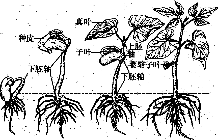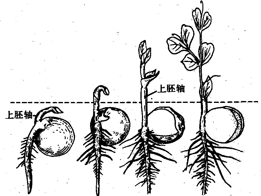 图 1 子叶出土幼苗(蓖麻) 子叶留土的幼苗 种子萌发时,仅子叶以上的胚轴伸长生长,形成植物的地上茎、叶系统。下胚轴不伸长,子叶留在土中。子叶内所贮藏的养料供给正在发育的胚芽、胚根应用,最后子叶因养料耗竭而解体,如蚕豆、豌豆的幼苗(图2)。水稻、小麦、玉米等也由于下胚轴不伸长,形成子叶留土的幼苗。 幼苗的鉴别 种子植物幼苗的形成规律及形态特征常随植物种类而有不同,这对于植物识别与分类以及杂草防除等都有意义。鉴别幼苗的依据主要有下列诸方面。 胚轴的长短 除下胚轴伸长与否外,上胚轴伸长与否也是比较稳定的特征。十字花科、伞形科、毛茛科和报春花科等的许多种类,在幼苗期其上胚轴都是不伸长的,幼苗呈莲座状,大车前的叶片能直接从两片子叶之间长出来,藜、繁缕等的上胚轴则明显伸长。上胚轴毛的有无 旱莲草、水苋等的上胚轴有毛,而鹅不食草的上胚轴则无毛。
