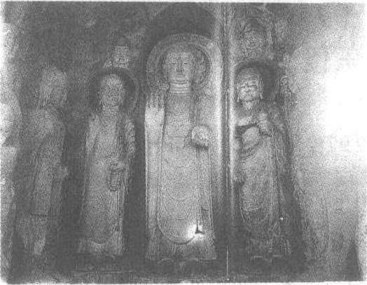 | 释义 | 广元皇泽寺大佛楼石窟初唐。主尊接引佛高5.1米,两身菩萨高约4.4米。四川省广元市皇泽寺第10号大佛窟。窟高7米,宽5.8米,是皇泽寺最大的石窟。身高4米以上的造像就有五尊,另有浮雕天龙八部及武士。此窟作品是皇泽寺造像发展到高峰的产物,为我国初唐石窟造像的优秀范例。主尊接引佛立于莲座之上,右手作施无畏印,左手托一小盒。着通肩袈裟,胸前系一吉祥花结,衣纹规矩富于装饰性。佛的面相丰圆,下颌微上翘,气度不凡。两旁的弟子虔诚肃穆。两身胁侍菩萨面颐丰满,露出娴雅的微笑,给人以亲切之感。宝冠的装饰、耳饰、璎珞均十分精致。璎珞垂于膝下,再佩以项圈、花腰带,显示出装扮的华丽和高贵。长裙的衣纹飘洒自然。此两尊菩萨像是皇泽寺摩崖造像的精致之作。此窟的力士,天王像也颇为雄健。