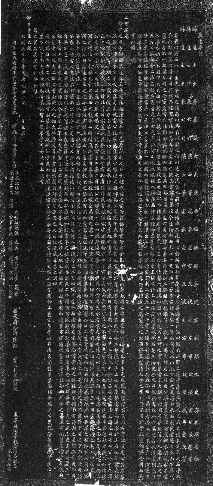| 释义 | 广惠渠碑记guanghuiqu beiji明成化五年(1469)刻。现立于泾阳县泾惠渠管理局渠首管理站碑亭。明陕西巡抚项忠撰文,陕西左布政使张莹书丹,陕西右布政使娄良篆额。半圆碑首,高1米。篆额“新开广惠渠记”。碑高2.50米,厚0.39米,宽1.11米,方座宽0.9米。碑文24行,行14字,楷书。碑文叙述自郑国渠以来历代水利史,历代各渠灌溉亩数,广惠渠开修起因、过程、修渠人、灌溉亩数及其规模和防洪设施等。