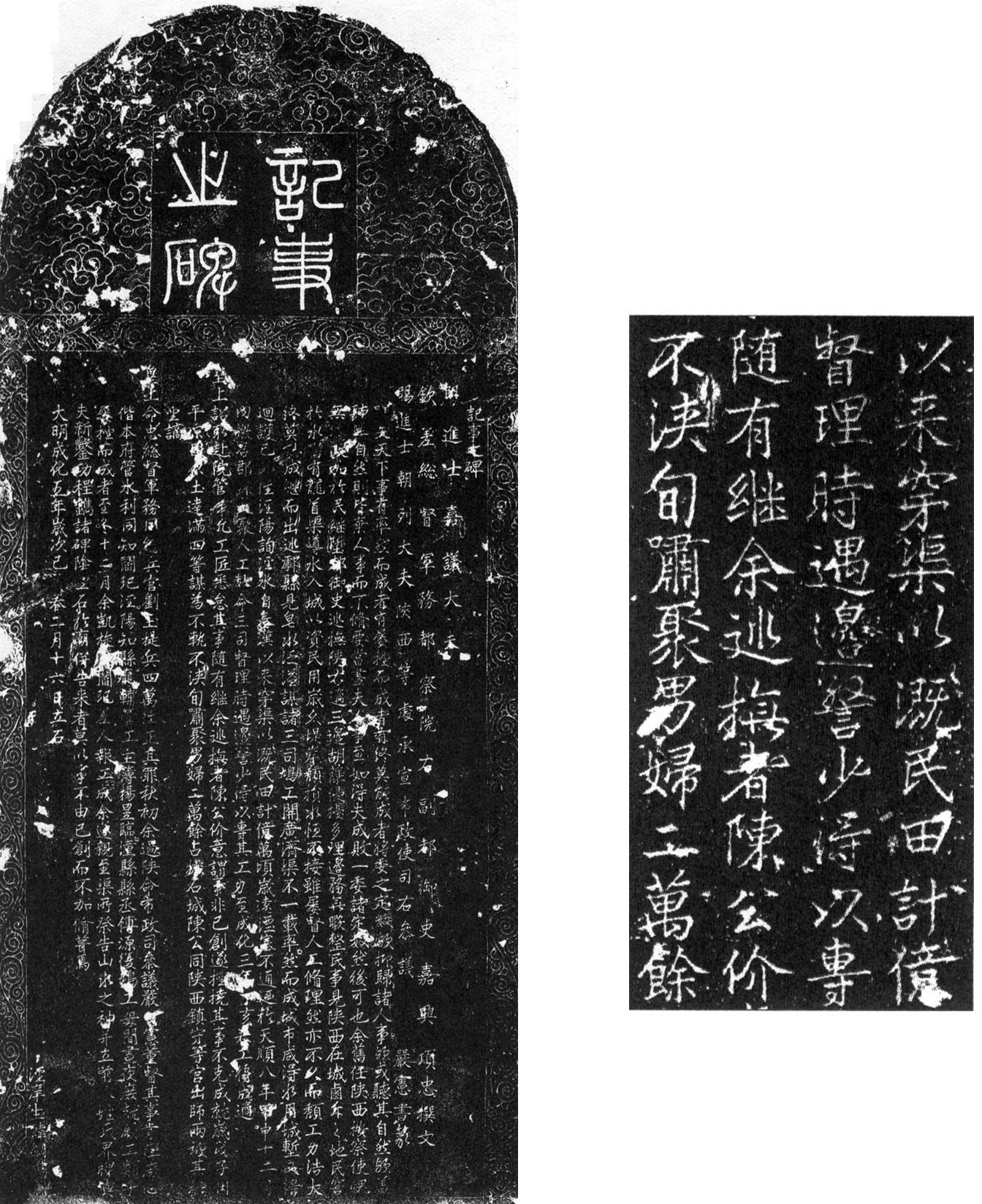 | 释义 | 广惠渠记事之碑guanghuiqu jishizhibei明成化五年(1469)刻。现立泾阳县泾惠渠管理局渠首管理站碑亭。半圆碑首,高0.49米,额篆“记事之碑”,碑高1.71米,宽0.74米,厚0.15米。碑文14行,行42字,楷书。碑文主要记叙项忠修广惠渠之过程。