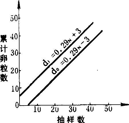 (见图)为: d0=0.29N-3 d1=0.29N+3 在抽样调查前,先将一系列N值(调查株数)代入这两个方程,即可得出这一分布型的序贯抽样查对表(表1)。若在田间检查20株,有卵株率小于表1中查20株的d0值,表示不须防治;大于d1值,表示须防治;若处于d0~d1之间,可适当增加调查株数,若仍在d0~d1之间,可暂不进行防治。其理论抽样数为: