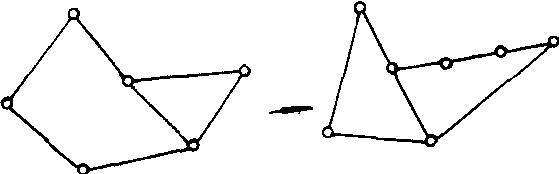 | 释义 | 库拉托夫斯基定理kulatuofusiji dingli图G是平面图的充分必要条件的判定定理.此定理由库拉托夫斯基在1930年给出:图G是平面图当且仅当G不含与K5或K33在2度结点内同构的子图.有两种操作不影响图G的可平面性. 如图中的左图,在给定图G的边上插入(添加)度数为2的点,即将原来的一条边变为两条边;右图则是将关联于度数为2的点的两条边缩成一条边,即删去2度点.如此,可使下图中左图变为右图.