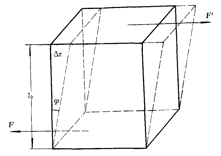 ε表示正应变,是一个纯数。正值表示拉伸形变,负值表示压缩形变。直杆沿轴向被拉伸时,则横向收缩;直杆沿轴向被压缩时,则横向膨胀。设想直杆横截面是正方形,边长为b0,横向收缩后边长为b,则横向应变(或 物质弹性特征的物理量。物体受切应力作用时产生切应变(剪切应变)。如图2所示,一个内部结构均匀的正方弹性体受到切应力作用,形状发生变化而产生剪切形变。形变后,与下底面平行的各截面都发生了位移,但任一截面的位移与该截面至下底面的距离之比都是相同的。ᵠ为正方体端面的角位移。平行截面的位移Δx与该截面离底面的距离l0之比称为切应变。其公式为 ![]() 如果形变很小,则ᵠ很小,tgᵠ≈ᵠ,因此有 ![]() 切应变ᵠ也是一个纯数。 对应于流体静压强的应变是体应变,即体积的变化ΔV与原体积V0的比。体应变可表示为: ![]()