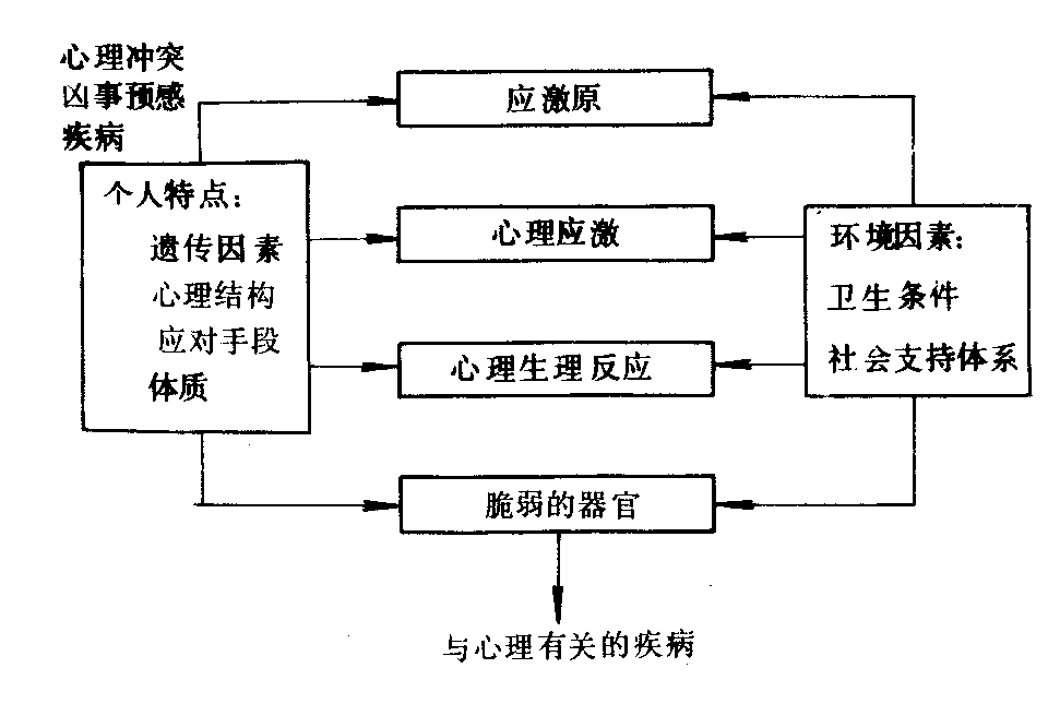 图4—33 应激水平与工作效率水平关系 应激的不良后果 随着医学由生物医学模式转向生物一心理一社会医学模式,人们愈来愈认识到心理、社会因素对机体健康具有重要意义,心身疾病的概念也日趋扩大。心理应激对健康的不良影响表现在: ❶心理应激可加重已患的疾病; ❷心理因素可作为疾病的促发因素,但必须通过脆弱的器官才能起作用(图4—34)。