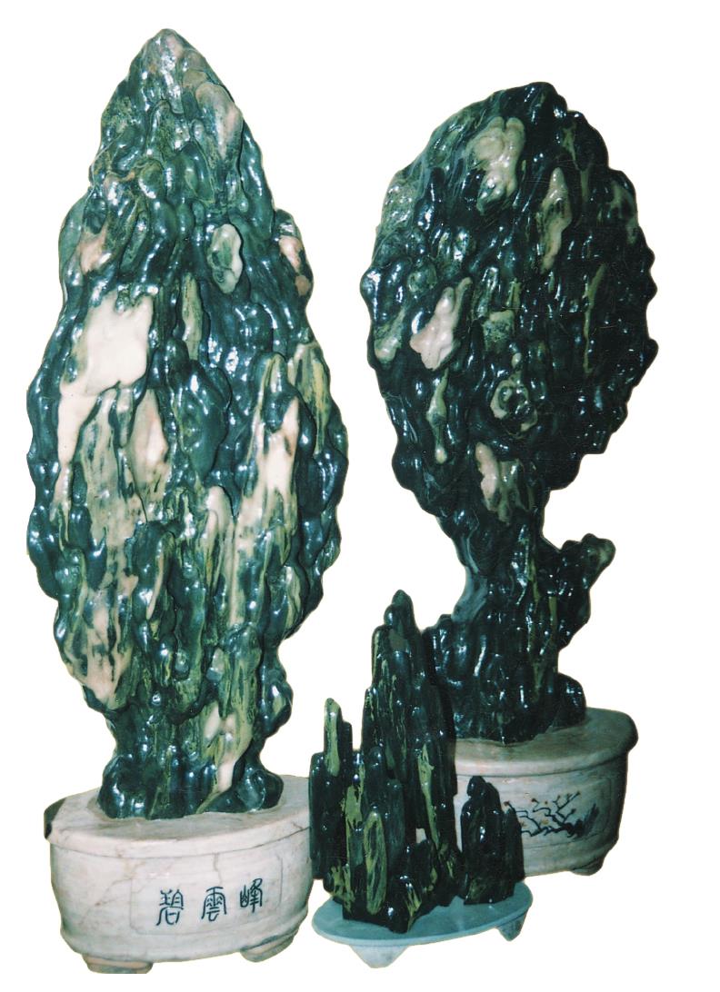 | 释义 | 庞公石清水县特产。产于小华山脚下的牛头河谷地一带。探明储量 15.7 亿吨,为火山岩石,质地密致,坚而不脆,硬而不滑。以深绿色为主体,各色翠纹萦绕于石,形态各异。庞公石具有极高的观赏、收藏价值,历来被古玩玉器收藏家所珍爱。宋代山阴(今浙江绍兴)人杜绾所著的《云林石谱》收入南北各地奇石 110 种,其中就有庞公石,当时已被采用,供人观赏。明、清时期,庞公石不仅被选为御用贡品,陈设于皇家园林,而且逐渐进入寻常百姓家庭。民间常把庞公石视为吉祥的象征,或陈列于案几之上,或放置于家门左右,倍加爱护。弄石家匠心独具,创作工艺巧夺天工,有古今人物、飞禽走兽、江河峻岭、花草树木等多种类型。20 世纪 90年代初,在北京举办的清水“庞公石”展览会上,其独具的石质、古朴典雅的造型,一举轰动京华,被誉为“中国一绝”。曾在中央电视台在《祖国各地》节目中播出专题片,产品行销全国,远销海外。
