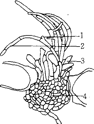 座枝孢属 1. 分生孢子侧枝 2. 分生孢子 3. 分生孢子梗 4. 分生孢子座 |
