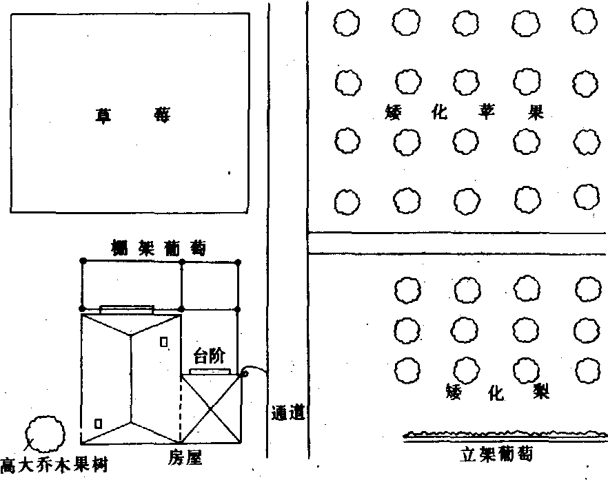 注意事项 庭院栽培树种不宜多, 每种数量也宜从少开始, 待积累经验后, 逐步按需要扩大; 对有共同病虫害, 或相互禁忌的树种, 不宜就近并栽; 以观赏为栽培目的时, 可以使果树与观赏植物或蔬菜适当配栽或间作(见图)。作为生产性庭院栽培时, 宜采取联户集中种植一、二种果树。行向以东西行为好,高、矮树种南、北错开。同时, 要通过修剪控制树冠或架面, 防止彼此竞争空间,影响光照;庭院栽培日久, 病虫就会滋生蔓延, 应及时注意防治。