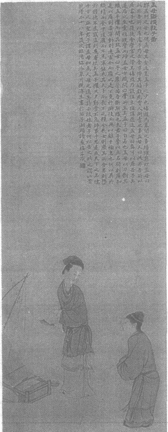 | 释义 | 康涛孟母断机教子图轴清。康涛绘。绢本设色。纵88.4厘米,横31厘米。北京故宫博物院藏。康涛,生卒年不详。后更名焘,字逸斋,一字康山,号石舟,又号既济生,晚号天笃山人、莲花峰头不巧人、茅心老人、荆心老人。浙江杭州人。布衣。善画山水、花鸟,尤精仕女,姿态秀逸。雍正五年(公元1727年)作《三娘子像》,乾隆二十年(公元1755年)作《仕女打鹂图》。亦工书,年七十能作蝇头小楷。此图是根据《列女传》中孟母断机教子的内容而绘。下部左侧画纺织机,孟母侧身立于织机旁,右手执刀,左手指着织机,回过头来语重心长地对儿子进行教诲,孟轲躬身揖手立于母前,态度恭顺,神色略带惊恐,显得童真稚气。人物衣着朴素,造型自然质朴,面部表情描绘细腻,生动形象。极见功力,设色古雅。上方作者自题:“孟母断机教子图”,以楷书题述《列女传》中孟母三迁择邻和断机教子的内容。署款“乾隆二十八年岁次昭阳协洽泉月既济生画于西子湖头读画楼并识”。乾隆二十八年为公元1763年。