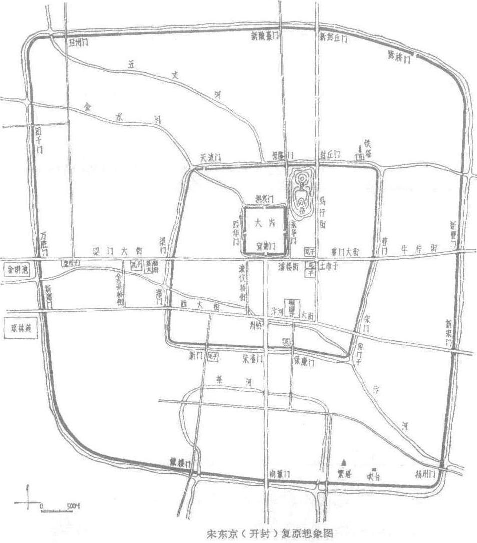 | 释义 | 开封城前身是唐朝的汴州,位于黄河中游平原上,地处大运河的中枢,水陆交通便利,手工业和商业相当发达。战国时期魏国、五代的后梁、后晋、后汉、后周和北宋均先后在此建都,人称汴京,别称汴梁,正式称号为东京开封府。该城采取罗城、内城、宫城三重城墙的布局,均有护城河。罗城周长19公里,南、西各五门,东、北各四门。每座城门均有瓮城,上建城楼和敌楼,城墙每百步(155m)设有防御用的马面。内城周长9公里,四周各二门,布置衙署、寺观、府弟、民居、商店、作坊等。宫城南面三门,余各 一门,这种皇城居中的布局为以后金、元、明、清所沿用。北宋在此建东京城,取消了以围墙封闭里坊和市场的制度。住宅、店铺、作坊均临街混杂而建,在水陆交通便利的城东南区、东北区和西区形成繁华的商业区,如《清明上河图》中所描绘的,主要街道人烟稠密,屋舍、酒楼、茶馆、店肆鳞次栉比,还出现了二三层的临街商业建筑,城市已显示出一片繁华景象。