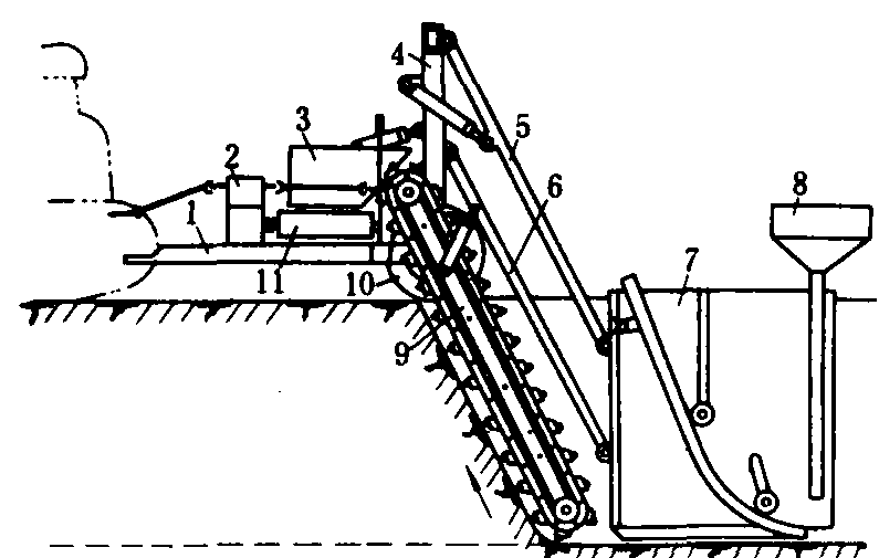 牵引式开沟铺管机 1.机架; 2.传动箱; 3.操纵台; 4.门架; 5.上平行杆;6.下平行杆; 7.管箱及滑道;8.滤料斗; 9.链齿挖掘部件; 10.行走轮; 11.排土输送带 结构组成 主要由挖掘部件、排土部件、铺管装置和坡降控制装置等部分组成。 挖掘部件 主要有链刀式和链斗式两类。在拖拉机悬挂式和牵引式开沟铺管机上多采用链刀式,它是将切土刀片按一定的配置和间距固定在专用链条上组成环形挖掘链,切下的土壤随刀片向上输送。改变刀片在链条上的固定位置即可改变开沟宽度。挖掘链由梁架支撑,靠油缸动作绕其上端的驱动链轮轴转动,以实现升降或调整开沟深度;调节其下端的随动轮则可调整张紧度。挖掘链的线速度一般为1.9~3.5米/秒,分高低两档,可按作业条件选用。通常还设有倒链档。链斗式挖掘部件由链斗和专用链条组成。链斗由环形刀片和开闭的斗底板组成,按一定间距固定在专用环形链条上。由环形刀片切下的土壤落入链斗内,随链斗向上输送。当链斗转到环形链的顶端开始向下转时,斗底板将土推出。这种挖掘部件的开沟宽度不能调节,多用于大型自走式开沟铺管机。 排土部件 有螺旋推运式:输送带式和螺旋滑板式等类型。螺旋推运式是用转动的螺旋推运器叶片,将挖掘部件输送上来的土推送到沟外两侧,多用于土方量不大的沟型; 输送带式是用回转的环形橡胶输送带将土输送到沟外一侧,其输送距离较远,多用于土方量较大的沟型; 螺旋滑板式是将土引入一段螺旋形滑板,改变土的运动方向,使其滑向沟外一侧,亦多用于土方量不大的沟型。 铺管装置 常用由角钢弯制的铺管滑道。铺放瓦管等刚性管材时,由人工将管材逐节放入滑道,随机组前进而滑入沟底铺放。铺放波纹塑料管时,装在盘架上的成盘塑料管自动经滑道滑入沟底铺放。较大的机型,通常设有管箱与滤料斗。 坡降控制装置 有自动控制和人工控制两种。自控坡降装置用激光扫描器设定基准,接收器自动控制沟底坡降,其控制质量好,操作简便,但价格昂贵。大多数机型采用人工坡降控制装置,即使驾驶员眼睛、装在机器操纵台上的标记和等距设在行程地面上的标杆三点成一直线,按坡度要求依次增加(或减少)地面各根标杆的标高。即可控制沟底坡降。 工作过程 开沟铺管机在行进过程中,挖掘部件铣削土壤并将土向上输送,再由排土部件将土输送到沟外一侧或两侧,从而形成窄而深的矩形断面埋管沟,管材由铺管装置滑入沟底铺放。通常在铺设地下排水管道的同时,管道下面与上面铺放粗砂等滤料,以防止地下水夹带泥沙进入管道而淤塞。然后用其它机具或人工埋沟。 开沟铺管机trencherpipelayer一种能在一次作业中完成铺管、铺放滤料等多项工序的机械。分为无沟铺管机、链刀式和链斗式铺管机等三种类型。无沟铺管机是在鼠道排水的基础上发展起来的施工机械,其工作部件是带塑孔器或铺放管道的柱形切窄沟的犁体。工作时,在地里开一条窄沟,同时向沟里铺放排水管道和滤料,几天后沟缝自行弥合,排水管便被埋在地下。链刀式开沟铺管机是用带刀的旋转链条开成矩形沟,被切土壤由螺旋输送器运至沟的一侧或两侧,管道通过管箱铺设于沟底,接着填入滤料。链斗式开沟机由两根链条带动的挖土斗进行开沟工作,其他工序与链刀式基本相同。 |