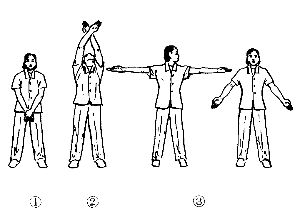 练功十八法第1套第4节。动作过程:分腿直立,两手在腹前交叉,左手在前。(图2—4—124—❶)❶两手交叉上举,目视左手背。(图2—4—124—❷)❷两臂经体侧划弧下落还原成预备姿势。(图2—4—124—❸)❸❹动作与❶❷相同,目视右手背。共做4个8拍。两臂上举时要挺胸收腹。此功法对肩关节疾病有较好的治疗效果。