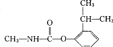 性能 纯品为白色结晶状粉末,熔点96~97℃。工业原粉为浅红色片状结晶,密度0.62,沸点128~ 129℃(2666.448帕),熔点89~ 91℃,闪点156℃分解温度为180℃,蒸气压0.133帕(25℃ )。25℃时,在丙酮中溶解度400克/升,在甲醇中125克/升,在二甲苯中 <50克/升,在水中265毫克/千克。在碱性和强酸中易分解,在弱酸中稳定。对光和热稳定。对高等动物毒性中等,大白鼠急性口服LD50为403~ 485毫克/千克,小鼠487~ 512毫克/千克,雄大白鼠急性经皮LD50>500毫克/千克。对兔眼睛和皮肤刺激性极小,试验动物显示无明显蓄积性,在试验剂量内未发现致突变、致畸、致癌作用,两年喂养试验,无作用剂量大鼠为0.5毫克/千克· 天,小猎兔犬为8.7毫克/(千克·天); 鱼毒较低,鲤鱼LC50>10毫克/千克(48小时),金鱼LC50为32毫克/千克(24小时),对蜜蜂有毒,具有较强的触杀作用,亦有一定的渗透和传导作用。作用机制是抑制乙酰胆碱酯酶。 应用 主要用于防治水稻飞虱和叶蝉科害虫,击倒力强、药效迅速,但残效期较短,一般只有3~ 5天。可兼治蓟马和蚂蟥,对稻飞虱天敌蜘蛛类安全。对甘蔗扁飞虱、马铃薯甲虫、厩蝇等也有良好防治效果。 异丙威isoprocarb又名叶蝉散、灭扑散、MIPC。氨基甲酸酯类杀虫剂。化学名称:2-异丙基苯基甲基氨基甲酸酯。化学结构式如下。纯品白色结晶、熔点88~93℃。2 666 Pa沸点128~129℃,不溶于水,易溶于丙酮、乙醇、二甲苯。属中等毒性,可防治稻飞虱、稻叶蝉。每公顷用2%粉剂30~37.5 kg,直接喷粉或混细沙土20 kg撒施。大鼠急性口服LD50为403~485 mg/kg、小鼠为487~512 mg/kg、兔为500 mg/kg。经皮LD50 (♂)大鼠及(♂)小鼠>500 mg/kg,对鱼毒性中等,鲤鱼48 hLC504.2 mg/L。