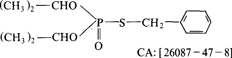 纯品为无色透明油状液体,工业品淡黄色油状液体,有臭味。沸点126℃ /5.33帕。较低温度下是白色固体。熔点22.5~ 23.8℃。难溶于水,18℃时溶解度0.1%,易溶于大多数有机溶剂。对光和酸较稳定,遇碱易分解。但在酸、碱介质中的稳定性均比稻瘟净高。毒性比稻瘟净低。大鼠急性经口LD50为490毫克/千克,雌小鼠急性经口LD501760毫克/千克,雄小鼠急性经口LD501830毫克/千克。雌小鼠急性经皮LD505000毫克/千克,对鱼毒性很小。对稻瘟病、叶蝉等病、虫的药效比稻瘟净好。其内吸传导作用也比稻瘟净强。主要作用机制为干扰病菌细胞膜透性,阻止某些亲脂的几丁质前体通过细胞质膜,阻碍几丁质的合成,使细胞壁不能生长,从而抑制菌体的正常生长发育。应用基本同稻瘟净,主要用于防治稻瘟病等水稻病害。喷雾或撒颗粒剂。撒颗粒剂时,稻田保持3厘米深水层3~4天。一般本品防治效果优于稻瘟净。棉株着药会引起脱叶。烟草和一些蔬菜对本品比较敏感。 异稻瘟净IBP有机磷杀菌剂。化学名称O,O-二异丙基-S-苄基硫代磷酸酯。化学结构式如下。原药为黄色液体。18℃时水中溶解度为0.1%,能溶于多数有机溶剂中。碱性条件下易分解。为内吸性杀菌剂。主要用于水稻、防治稻瘟病,亦可用于小粒菌核病和纹枯病。由于根及叶鞘具有内吸性能,除叶面喷洒,还有以颗粒剂施于田水中,但施药时间应在发病前,具有阻止菌丝侵入和新分生孢子形成的作用。原药对大鼠急性经口LD50为490 mg/kg,小鼠(♀)急性经口LD50为1 760 mg/kg,小鼠(♂)急性经口LD501 830 mg/kg,小鼠(♀)急性经皮LD50为5000mg/kg,对鲤鱼LC50(48 h)为10~40 mg/kg。