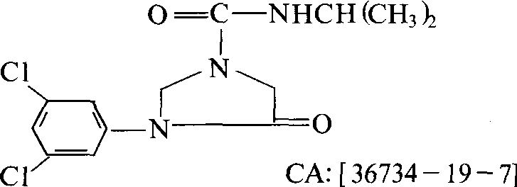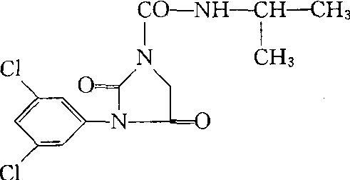 异菌脲iprodione又名朴海因、咪唑霉。二甲酰亚胺类杀菌剂。化学名称:3-(3,5-二氯苯基)-N-(1-甲基乙基)-2,4-二氧-1-咪唑啉甲酰胺。化学结构式如下。原药无色结晶,20℃溶解度,水中13 mg/L,乙醇、甲醇25 g/L,丙酮、苯甲醚300 g/L,二甲基甲酰胺、二氯甲烷500 g/L。一般稳定,无腐蚀性。1971年法国罗纳-普朗克公司推广。广谱保护性杀菌剂,对葡萄孢菌,丛梗孢菌,小核菌属有特效。对交链孢菌、长蠕孢菌、丝核菌、镰刀菌、茎点属菌、伏革菌、核瑚菌亦有效,抑制孢子萌发和菌丝生长,种子处理和叶面喷洒、烟剂熏蒸,及水果果实防腐,用于果树、蔬菜、花卉及谷物的多种病害。对植物安全,大鼠急性口服LD503500 mg/kg,经皮2500 mg/kg,慢性中毒试验未发现中毒反应,对蜜蜂无毒。