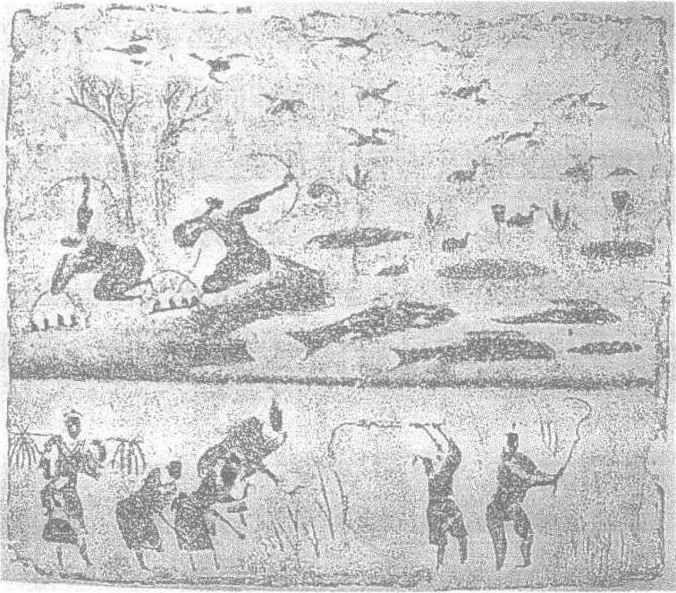 弋射收获图 弋射收获图,分上下两部分,上为弋射场面。如镜的秋水、莲荷丛生、水鸟嬉戏、鱼翔浅底。忽然,一群惊鸿从水面飞起,打破了大自然的静谧。岸上猎手,一弓身仰射,一跪坐回首,拔弓搭箭。下为收获情景。稀疏的庄稼,农家正忙于刈割,有人挥刀收割,有人弯腰掐穗,有人挑担提箪,跚跚而至。这是一件真切感人、富有诗情画意的作品。作者不是简单的再现自然,而是借助情节的发展和瞬间动态的描写以及诗 一般的景物描绘,从而创造一种意境,使人产生心灵的愉悦和艺术的联想。 这件作品构图饱满,疏密安排得当,空间处理也颇为成功。 |