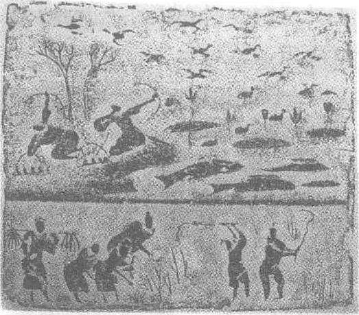 | 释义 | 弋射收获画像砖东汉。长39.6厘米,宽46.6厘米。1972年四川省大邑县安仁乡出土,四川省博物馆藏。浅浮雕。画面分上、下两层。上层为弋射图:在鱼、莲满池,野鸭凫游的河塘边的柳树下,二人正引箭拉弓,准备射向天空中一字列队飞翔的大雁。下层为收获图:稻田深处,二人在前挥镰刈草,三人在后俯身割稻,其后跟随着一挑担提篮的人。此画像以写实的手法,将一派怡淡、幽雅的田园风光和劳动场面呈现在众人面前,使人感受到作品浓郁的生活气息和勃勃生机。