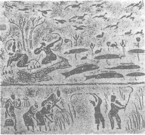 053 弋射收获画像砖汉代。成都出土。分上下两部分,上部“弋射”刻画两名射手在荷塘岸边引弓而射,惊散了一群塘中水鸟,箭还在弦的一瞬间,构成了紧张有趣的情节。下部“收获”,劳动者正在收割稻谷,人物组合均衡而富有变化,人物动态有弯有立,极富节奏,那挥镰者回头顾盼,使人物间的相互呼应跃然画面。这一反映现实生活的作品,充满着对劳动者和劳动生活的热情赞美。 弋射收获画像砖Yisheshouhuo hua xiangzhuan东汉画像砖,1972年四川大邑安仁乡出土。现藏四川省博物馆。画像砖长46.6厘米,宽39.6厘米。画面分上下两层,上层,荷塘边树荫下,二人正在张弓弋射,空中大雁惊飞。荷塘中有莲有鱼。下层为收割场面,两人持镰割稻、三人在后束捆、一人送饭,生动地再现了当时收获季节的农忙景象。作品画面完整、情调优美,是汉画像砖中的杰出作品。