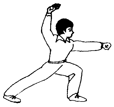 为弓步、上架、冲拳同时完成的基本动作。教学重点 基本同于弓步冲拳,上架时小臂要外旋。