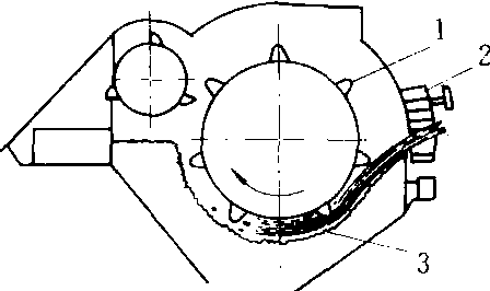 弓齿滚筒 1.弓齿滚筒 2. 夹持输送链 3.编织筛式凹板 |