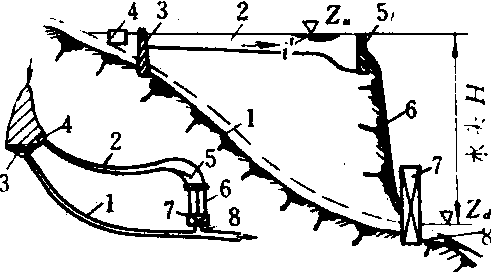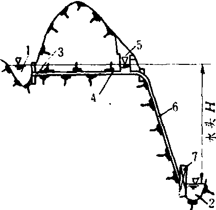 图2 有压引水道式水电站 1. 高河(或河湾上游) 2. 低河(或河湾下游) 3. 进水口 4. 有压隧洞 5.调压室(井) 6.压力钢管 7. 水电站厂房 |