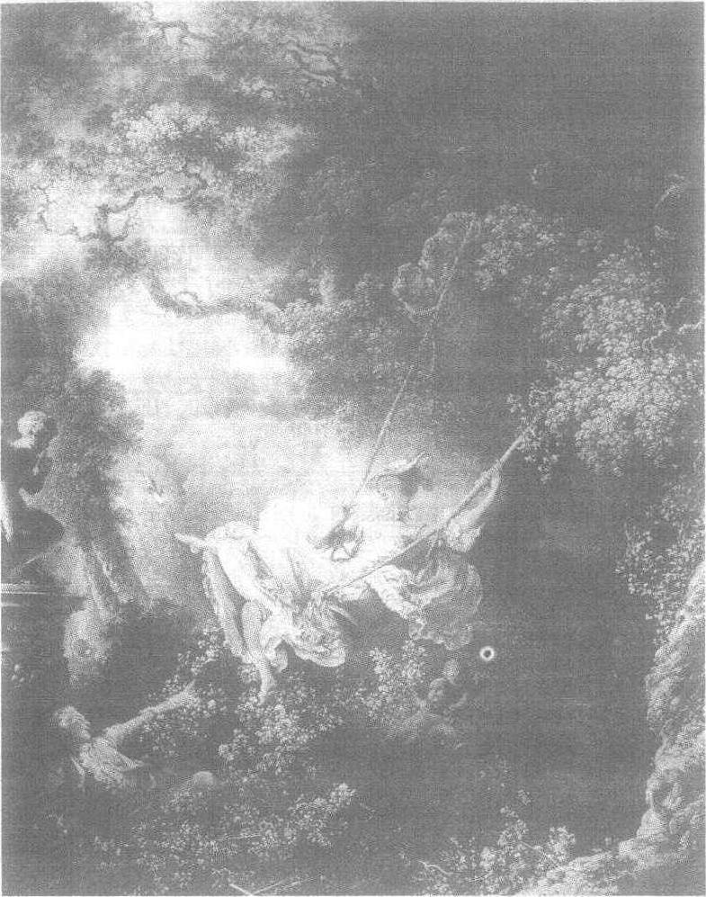 | 释义 | 弗拉贡纳《秋千》画面中央,绿荫之下,一位穿淡红衣裙的少女在荡秋千。她俏丽的身影像燕子般轻盈飞舞,荡得风飘裙带,露出纤纤玉足。一只脱落的绣花鞋旋转在半空中,引得躲在花丛后面偷看的情人丢魂落魄,万分喜悦。推动秋千的牧师——少女的父亲,则处在阴影里,几乎不为我们所察觉。画面上到处洋溢着对恣意放荡生活的暗示,渲染出偷看隐私的气氛,然而画家欢腾的笔触却令我们耳目一新。