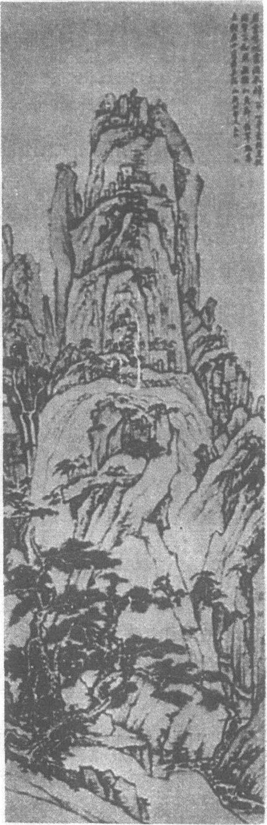 | 释义 | 弘仁黄山天都峰图轴清。弘仁绘。纸本水墨。纵307.7厘米,横99.9厘米。江苏省南京博物院藏。弘仁(公元1610—1664年),字六奇,号渐江,别号梅花古衲,安徽歙县人。明诸生。明之后去福建,从建阳古航禅师为僧,云游武夷等地,回歙县后常往来于黄山、雁荡间。工山水,兼画梅,曾学画于萧云从,受倪瓒影响最深,多写黄山松石,并根据对黄山的理解,创造出自己的艺术语言,寓伟峻沉厚于清简淡远之中,又因其人品高尚,被视为清代的倪瓒,与汪之瑞、孙逸、查士标为新安派四大家(即海阳四家)。弘仁留有不少传世的描绘黄山景色的山水画,此图即为其中的典型作品。天都峰是黄山著名的山峰,其奇险居黄山诸峰之首。作者以类似写生的形式对它进行描绘,奇伟的山峰危然耸立,峻拔沉厚,陡峭的山岩间奇松盘屈纵横,针叶如网。黄山的特点是以花岗岩为主,似大块岩石堆垒而成。作者以长直线条勾画出类似几何体的大石,这些线条除横竖外,还有折线、斜线,山体的细部则以一些小几何体构成,使山峰显现出平直的体势,雄放的姿态。画面几乎未用皴擦,具有一种整洁、苍劲之美和深沉的生命力,而古松和小松的描绘则使人直接体味到自然界生物的活力。作者所处的时代恰逢明末清初,他曾多次参加抗清斗争,当复明的愿望无法实现时,才由绝望转而摒弃世间纷扰,而潜心于绘画。其作品包含了作者复杂的心绪,给人以纯、静、冷的感受,具有远离尘嚣的深邃意境。