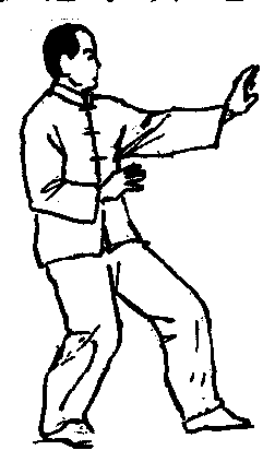 | 释义 | 三体式形意拳的基本姿势。三体式集中体现了形意拳身体姿势的基本要求。初学形意拳者必由三体式入门;学会形意拳后必以三体式站桩增长功力;每个形意拳的套路均以三体式起势和收势。因此,形意拳谱中有“万法出于三体式”之说。三体式分为左式(左手左脚在前)和右式(右手右脚在前)。形意拳套路中左式三体式居多。三体式的规格和要领是:两脚全脚掌着地,脚跟相对,前脚尖微内扣;右腿屈膝(膝内扣)半蹲,支撑身体的百分之七十;左腿膝微屈并内扣,支撑体重的百分之三十,躯干要保持正直并要做到缩胯收臀;松腰立脊,舒胸实腹;拔背沉肩;双肘要向下松沉;左掌掌心向前下方,五指分开,掌心内含;右掌拇指根节紧靠肚脐,手腕向前下塌;头正颈直,双眼透过前手食指向前平视。(图2—4—61)注意事项:老年初学者学习三体式时可由下及上逐步体会和掌握动作要领;练习三体式站桩时,腿的姿势不要太低,时间不易过长,以能保持正确的三体式姿势为度。