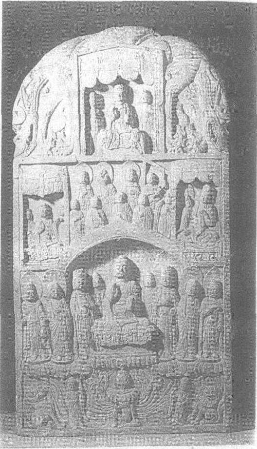 | 释义 | 张噉鬼造像碑北齐天保十年(公元559年)。高108厘米,宽57厘米,厚8厘米。1957年10月河南省襄县城西孙庄出土。河南省博物馆藏。碑额中间开一带帷幔的小龛,内雕半结跏趺坐的观音菩萨和二胁侍。碑身分三部分,上部左、右各开一龛,左龛内雕维摩居士,右龛内刻文殊及二胁侍,其间为九个相倚听法的人。中部大龛中,释迦结跏趺坐于莲座上作说法相,其左右立弟子、菩萨、罗汉、天王各一个。下部中间为一力士坐承博山炉,炉两旁分立比丘和蹲狮。碑背面上部浮雕“太子逾城出家”的佛教故事,下部刻造像铭记。此碑兼用直平刀法、漫圆刀法和阴线刻,刚柔相济,雕刻精细,人物形象具柔美之感。