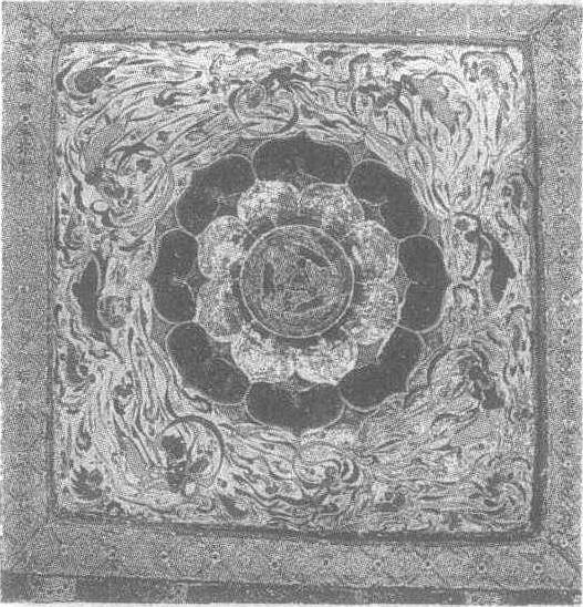 | 释义 | 三兔莲花藻井壁画隋。纵201厘米,横203厘米。甘肃省敦煌县莫高窟第407窟窟顶藻井内壁画。隋代莫高窟窟顶的精巧华丽超过了前代。藻井的设计由仿木结构向“华盖”式发展,井心宽大。此藻井中心绘悬空状莲花,圆状花心内有三只等距排列旋转而相互追逐的兔子。三只兔子共有三耳,但无论单看哪只兔子都非一耳,而给人一兔双耳之感。三耳相互连接构成一个三角形,与外层图案的圆形构图形成对比,丰富了线条。莲花以外是飞速旋转的天花和飞天。飞天资态各异,飞舞的方向与三兔追逐的方向一致。最外层为绘制繁密规整的边框及流苏。此藻井设计新颖,结构严谨,由里向外,疏密有致。画面动静结合,五彩缤纷,是隋代莫高窟藻井中的代表作。