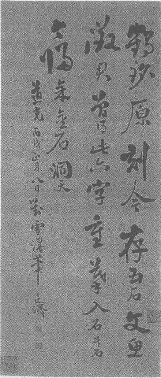 | 释义 | 张廷济行书瘗鹤铭残本跋清。纸本。纵109厘米,横45厘米。吉林省博物馆藏。张廷济(清乾隆三十三年—道光二十八年,即公元1768—1848年),原名汝林,字叔末,一字说舟,号竹田,又号海岳庵门下弟子,晚号眉寿老人,浙江嘉兴人。嘉庆三年,屡试不中,遂结庐高隐,以图书金石自娱。工诗词,家中收藏鼎彝、碑版及书画甚富,因而精于鉴赏考证,每一碑一器入手,即能知其真伪。工书,楷书多取法颜、褚;行书多取米芾;篆、隶皆上溯周秦汉魏。《清史列传》:“叔末书法米南宫(米芾),草隶独出冠时。”张宗祥云: “叔末早岁学王,小楷宗《黄庭》、《乐毅》,中年之后顶礼襄阳(米芾),大字楷书锋挺豪齐,至饶刷意,惟终觉金石之气充溢纸上,此米书别派也。”传世书迹有《临米芾苕溪诗轴》、《篆书吉日癸巳轴》,著有《桂声堂集》、《清仪阁题跋》、《眉寿堂集》等传世。此跋:“鹤铭原刻今存五石文鱼征君曾得此六字重摹入石其石今归余金石洞天。”款署:“道光丙戌正月八日对雪漫笔廷济。”款下钤<张叔末>及<圣彝考藏金石书画印>首行钤朱文<清仪阁>、白文<金石洞天>。此跋以行书为主,参入有篆意,用笔方圆兼备,以侧笔取势,笔画忽粗忽细,结字忽大忽小,布局错落,最后一行字形较小的款署与第一行字形较大的正文相互呼应,浑然一体。