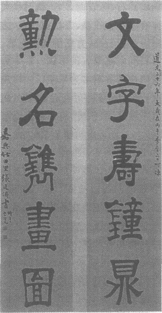 | 释义 | 张廷济隶书五言诗联清。纸本。纵135.5厘米,横32.7厘米。吉林省博物馆藏。张廷济(见《张廷济行书瘗鹤铭残本跋》条目)书。此五言诗联,上联“文字寿钟鼎”,下联“勋名镌画图。”上联款署:“道光二十六年太岁在丙午季冬二日呵冻。”下联款署:“嘉兴竹田里张廷济书时年七十有九。”款下钤有<竹田里张廷济印>、<叔末>两印。诗联用笔纯熟而有规律,行笔沉着稳健,结体宽博。点划生动挺拔,使转变化丰富,化圆转为方折,化弧线为直线,如“字”、“名”、“图”等字。上下联布局对称,有平正安稳之感,给人以朴实无华的自然美感。